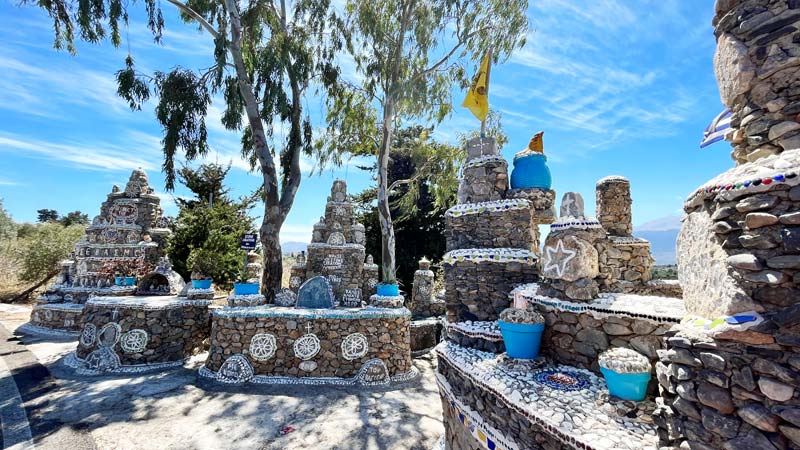This creation by Vangelis is located just outside the built-up area of Kefalas, along the road to Vamos. Texts on the structure welcome visitors to Kefalas, and because many tourists drive along this road, the Monument is relatively well known and many photos are taken. The house was built in 1995 and over the next ten years the exterior around the house has been transformed into in art environment, full of stone structures with the same characteristic as the stone monument.